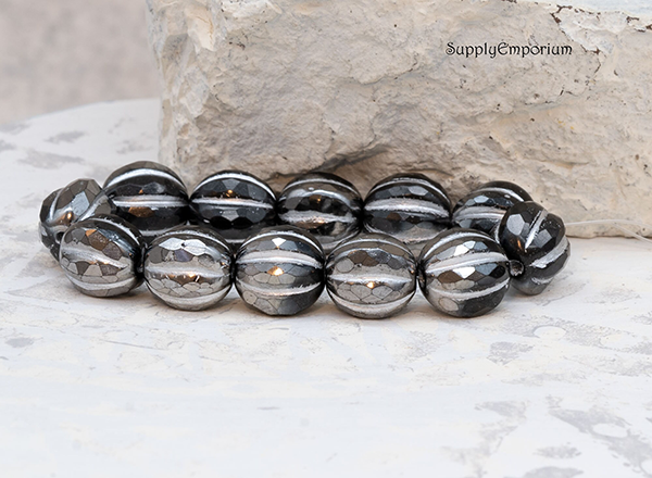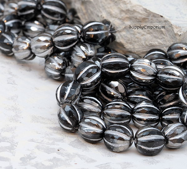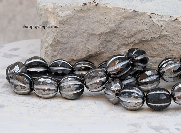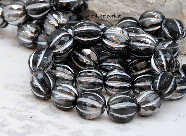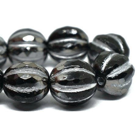 10mm Black Silver Wash Czech Faceted Melon – 12 pieces – 6324RR