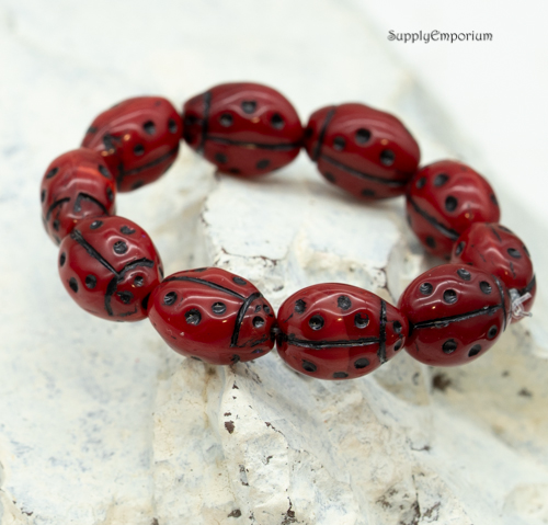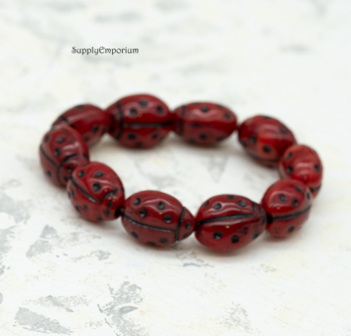 10x7mm Red Opaline w/ Black Czech Glass Lady Bug Beads – 10 Pieces – 3421R