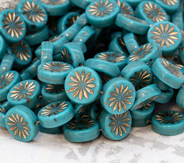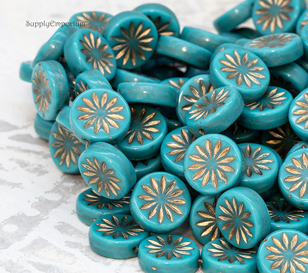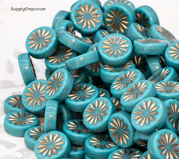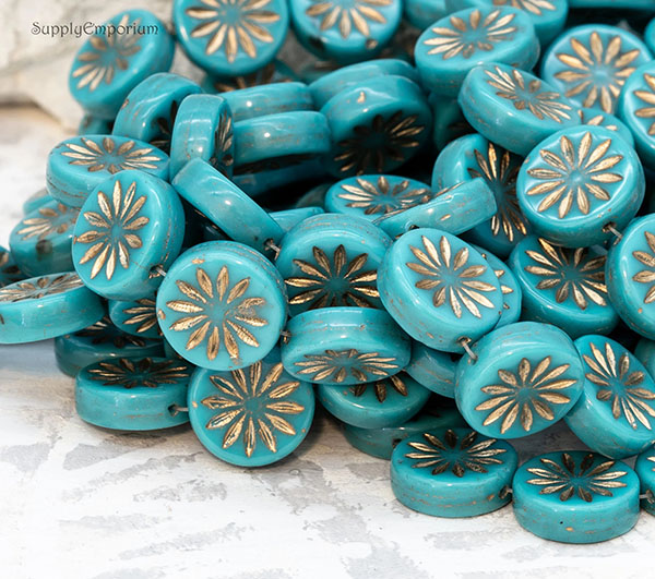 12mm Opaque Turquoise Gold Wash Aster Czech Coin – 10 pieces – 2764R