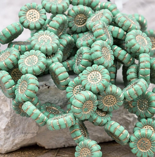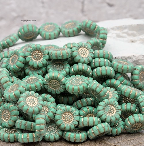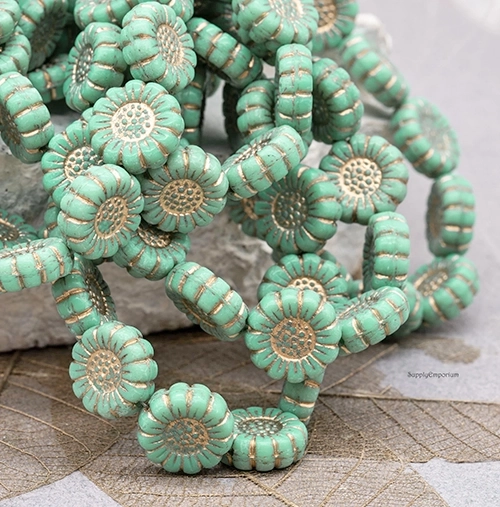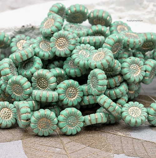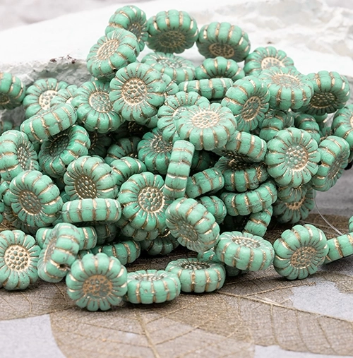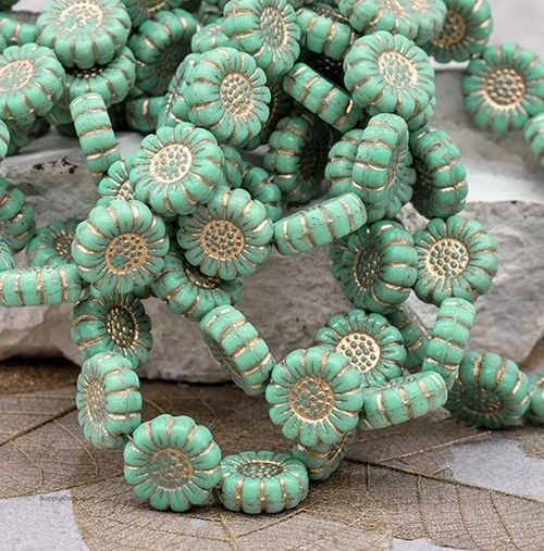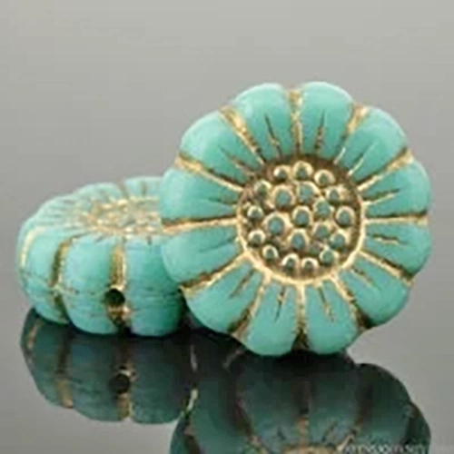 13mm Opaque Turquoise Gold Wash Czech Sunflower – 12 Pieces – 5535R