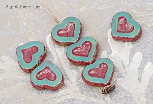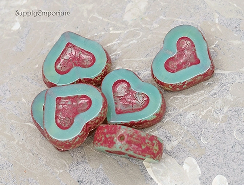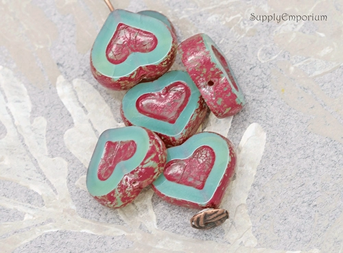 13x14mm Jade w/Red Picasso Czech Table Cut Heart – 6 Pieces – 2301R
