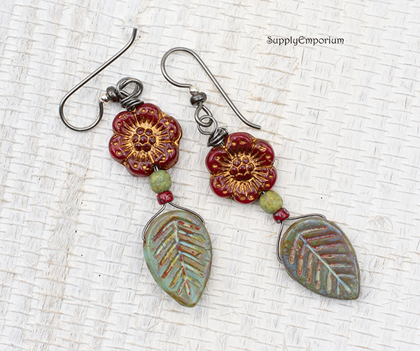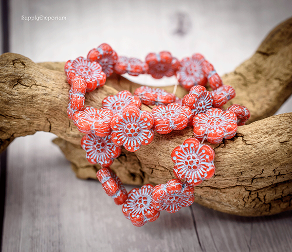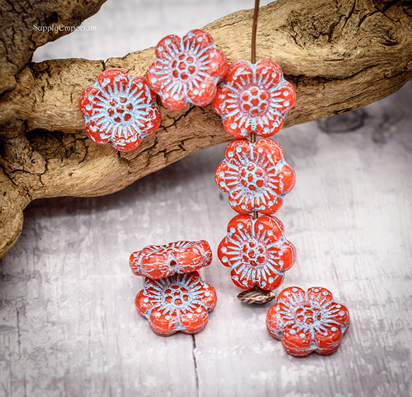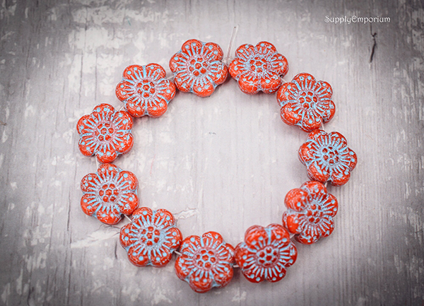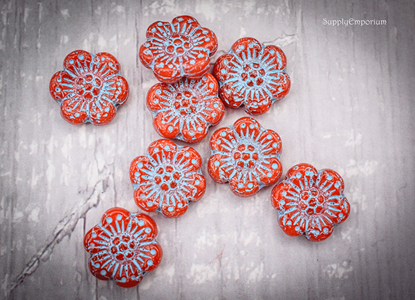 14mm Burnt Orange w/Turquoise Czech Glass Wild Rose – 12 pieces – 3832RA