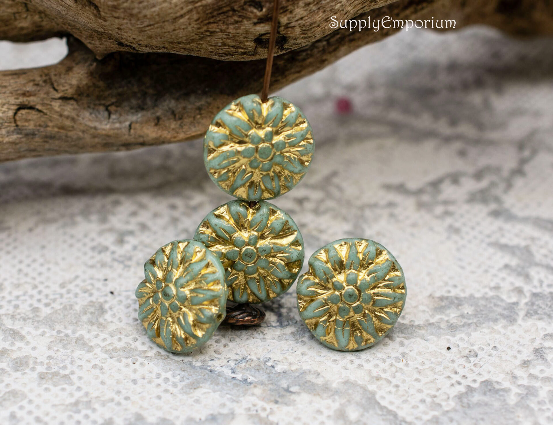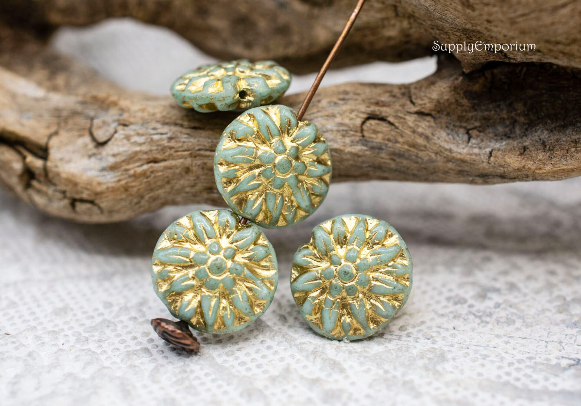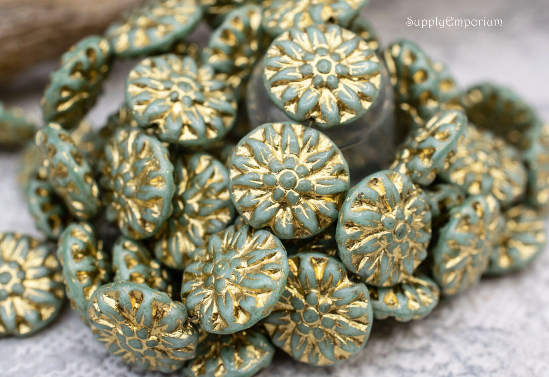 14mm Gold Wash Mint Green Czech Dahlia Flower – 8 pieces – 6719R
