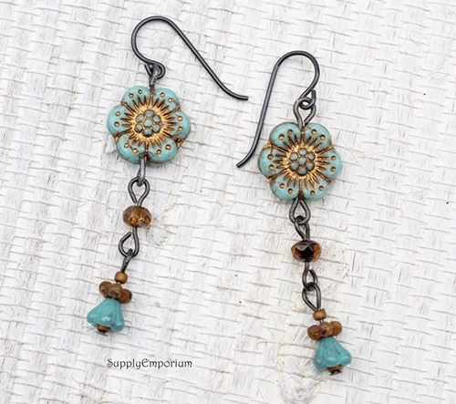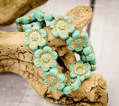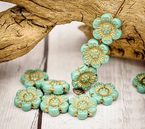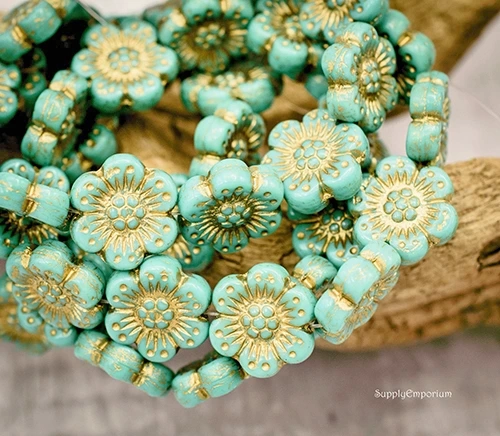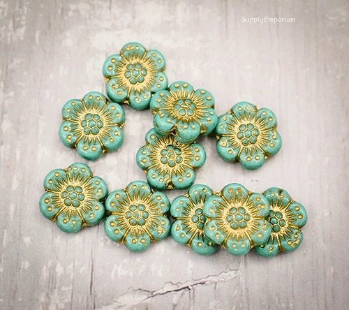 14mm Op Turquoise w/Gold Czech Wild Rose – 12 pieces – 6430R
