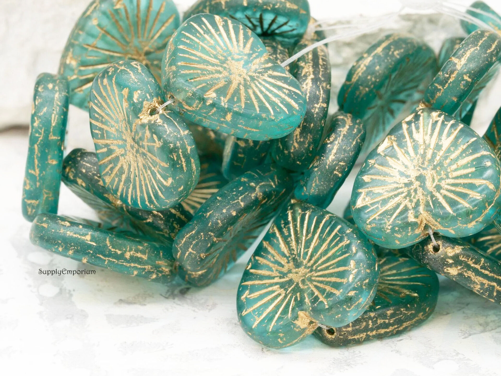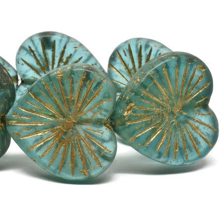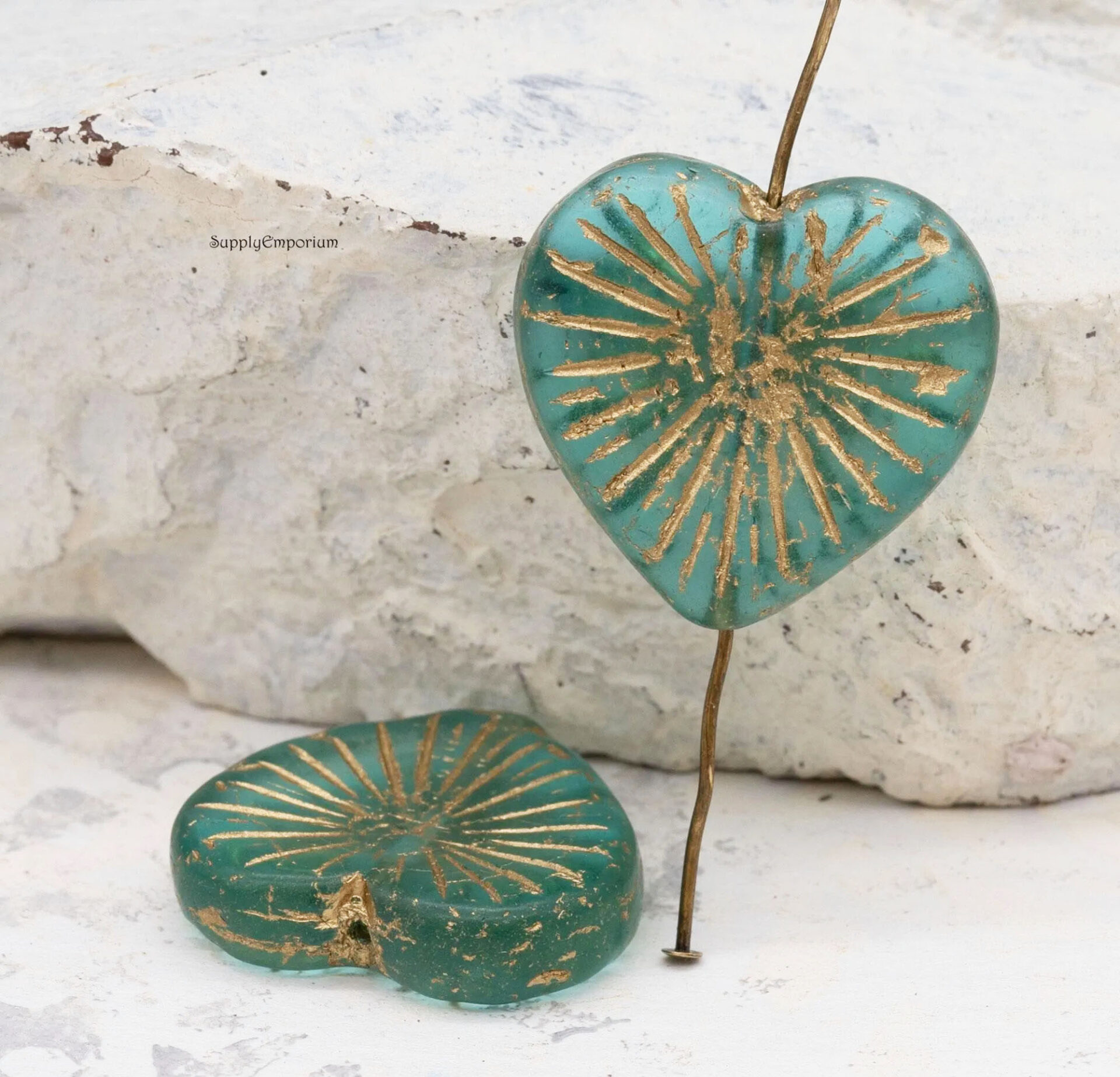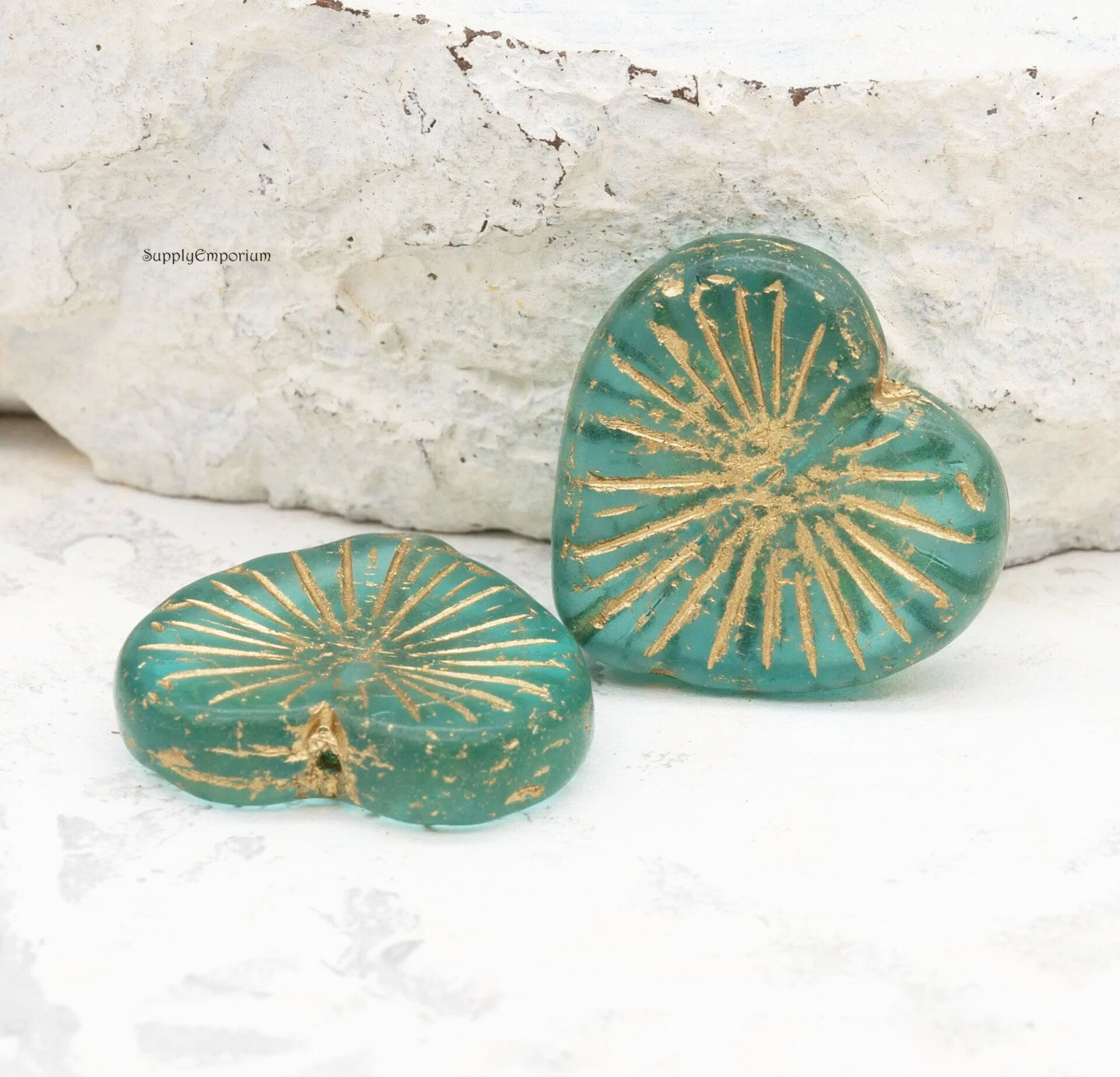 22mm Matte Sea Green Gold Wash Czech Table Cut Heart – 2 pieces – 1980R