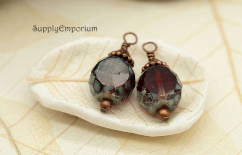 These Czech glass charms are wrapped with antique copper head pins. Quality red Picasso table cut round as focal and quality bead cap above the bead.