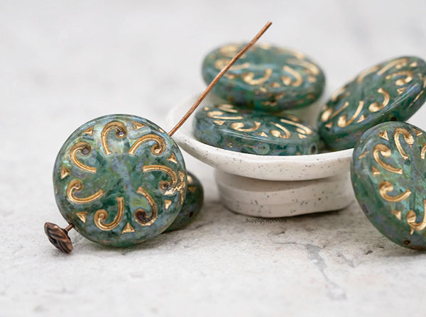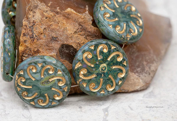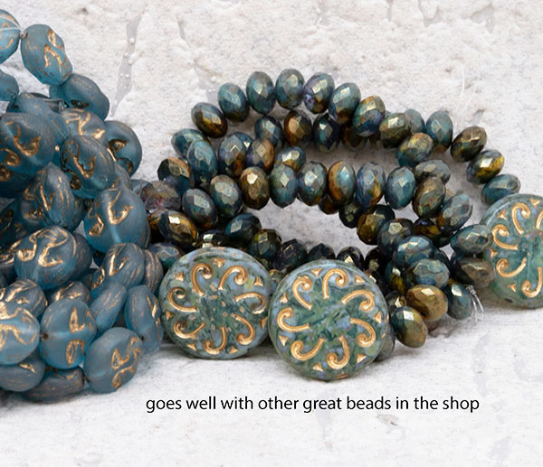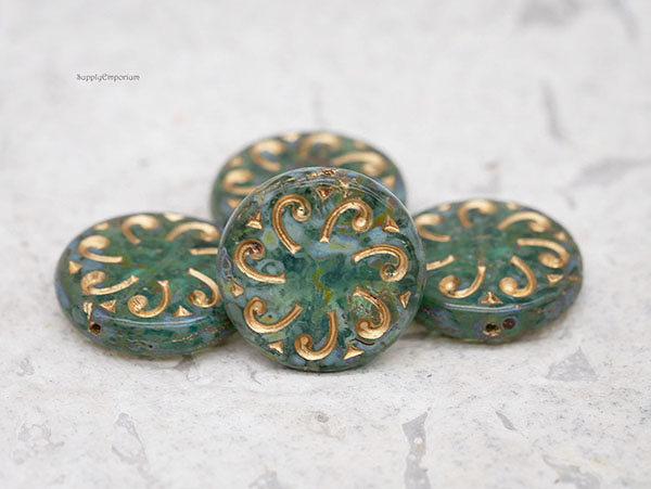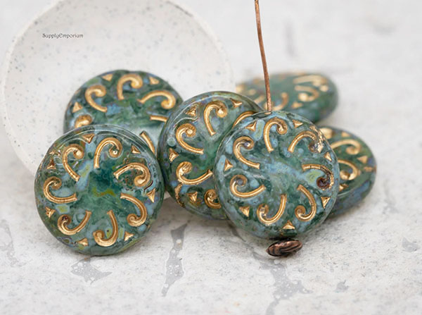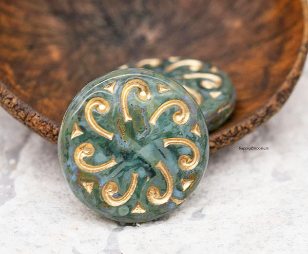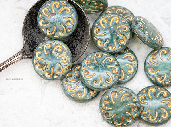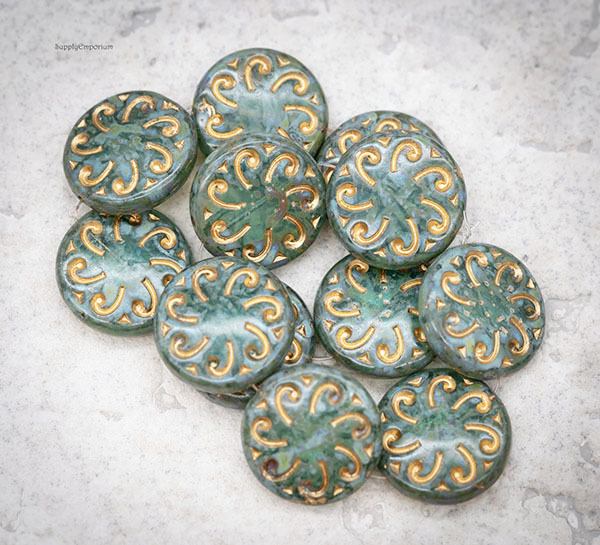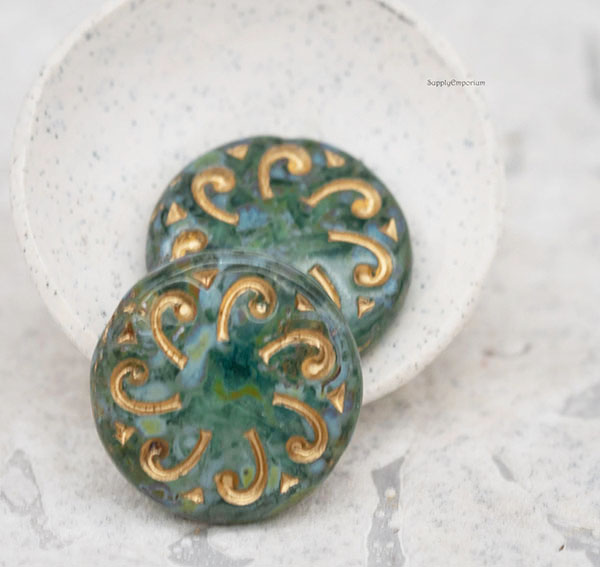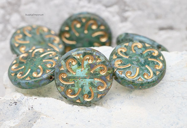 23mm Aqua Picasso w/ Gold Wash Sun Czech Glass Coin – 2 pieces – 4729R