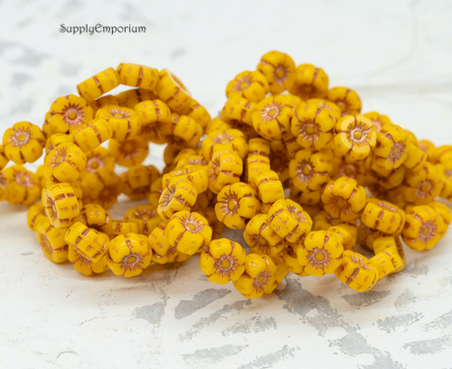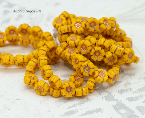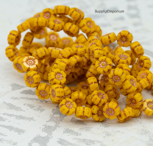 7mm Marigold Yellow w/Copper Czech Glass Hawaiian Flower – 12 Pieces – 2323RR