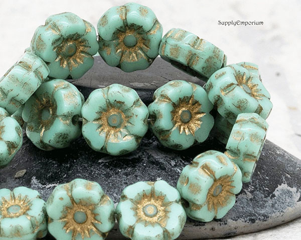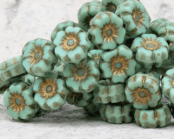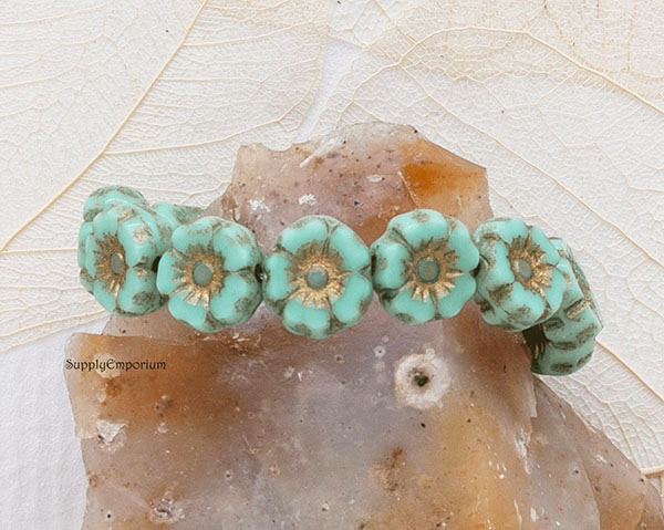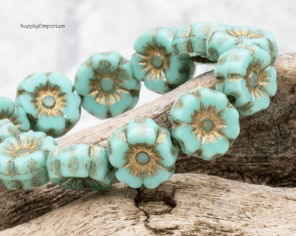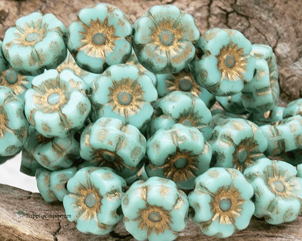 7mm Op Turquoise w/Gold Czech Flower – 12 pieces – 4410R
