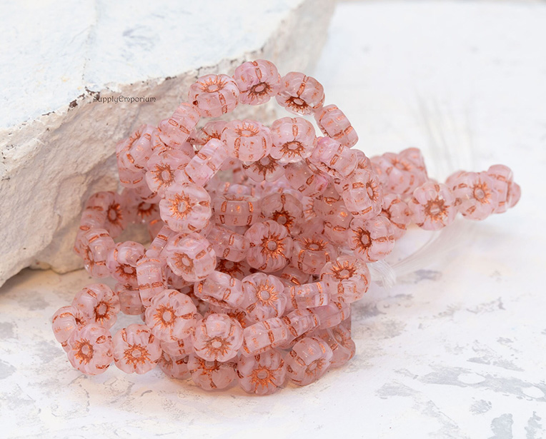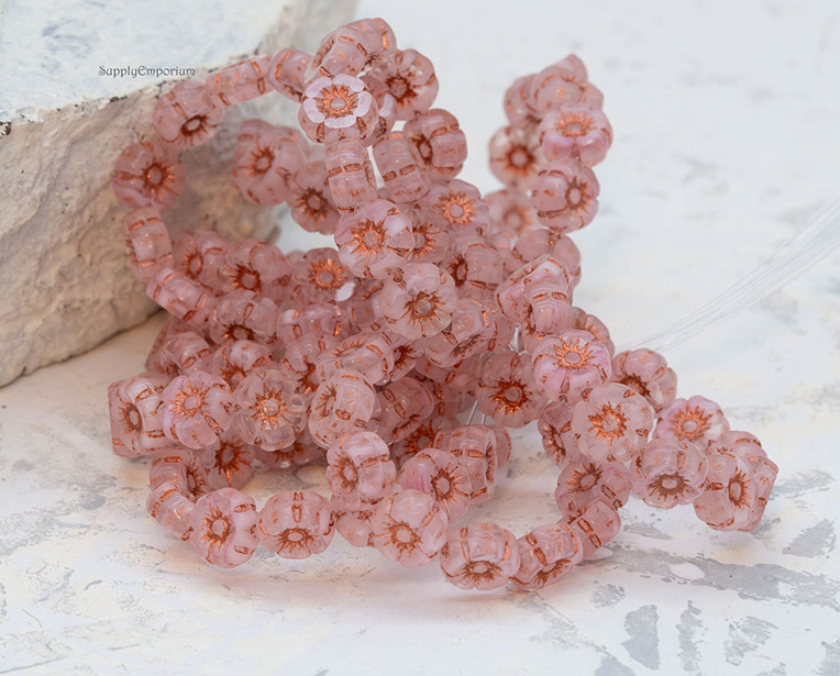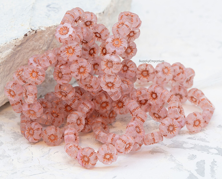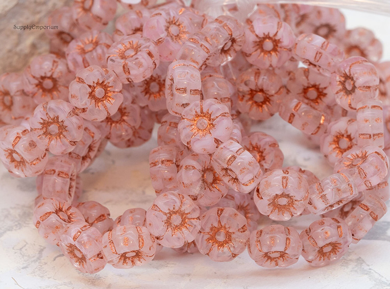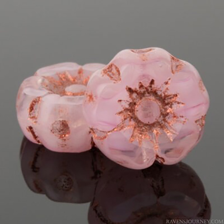 7mm Transparent Pink Copper Wash Czech Hawaiian Flower Bead – 12 pieces – 426RR