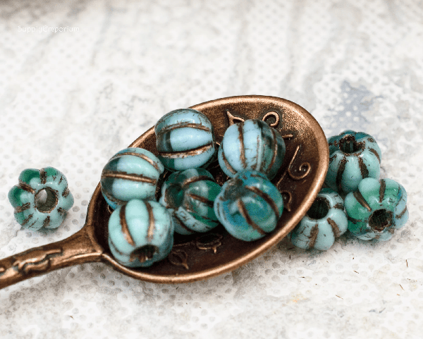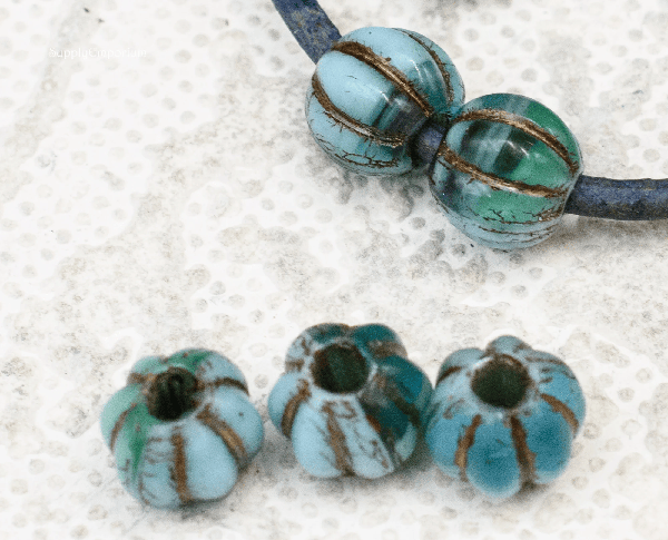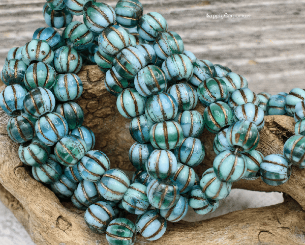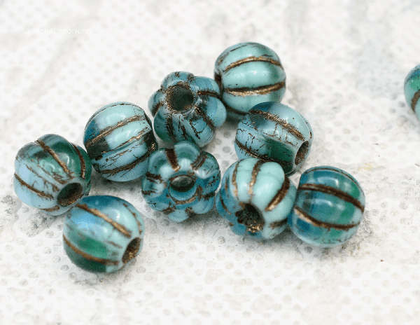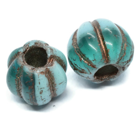 8mm Sky Blue Green Bronze Wash Czech Large Hole Melon – 20 pieces – 7347ROC25