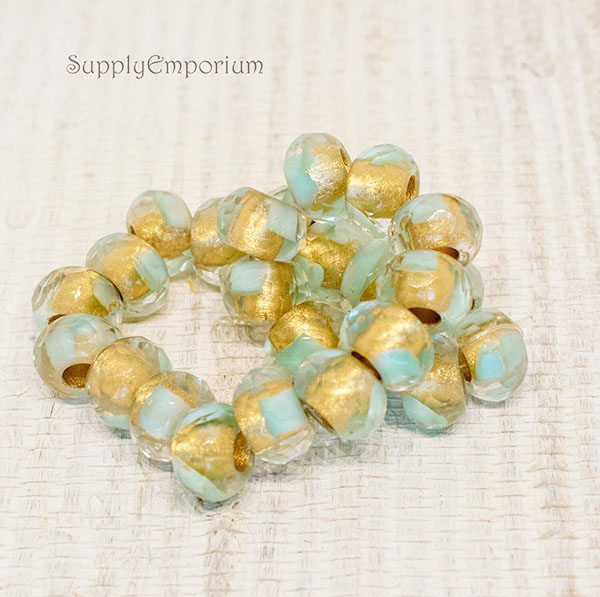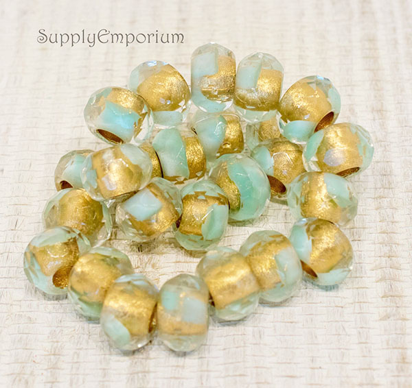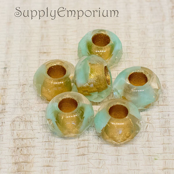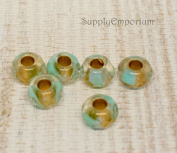8x12mm Blue Green and Gold Czech Roller Bead – 6 pieces – 6233ROC17