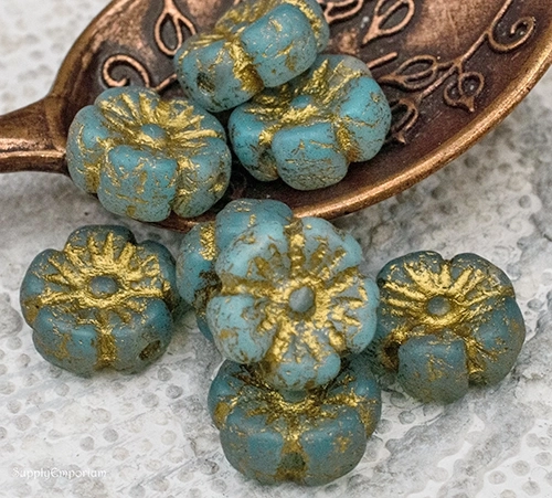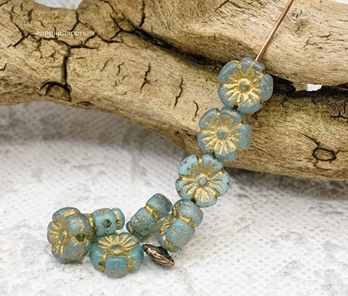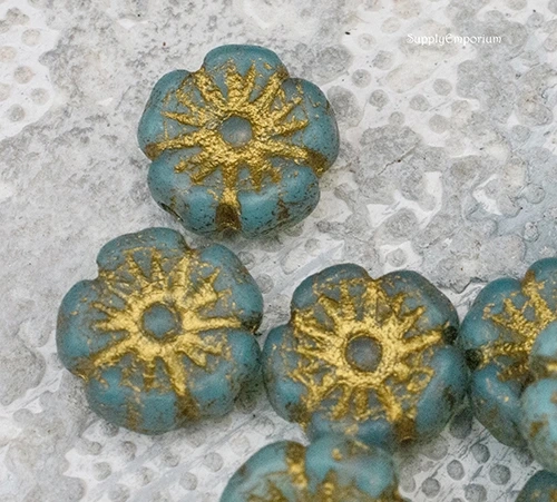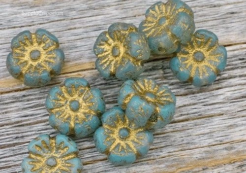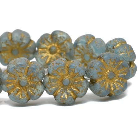 9mm Etch Sky Blue Gold Wash Czech Flower – 16 pieces – 2418R