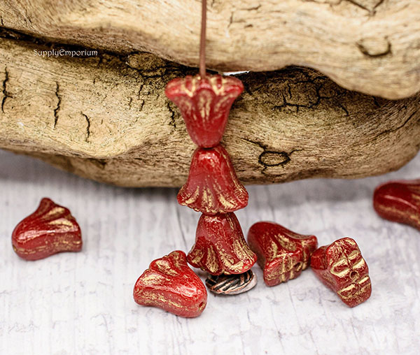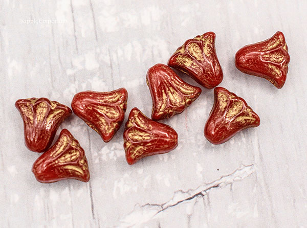 9x10mm Red Opaline w/Gold Czech Lily Flower – 15 pieces – 7406W