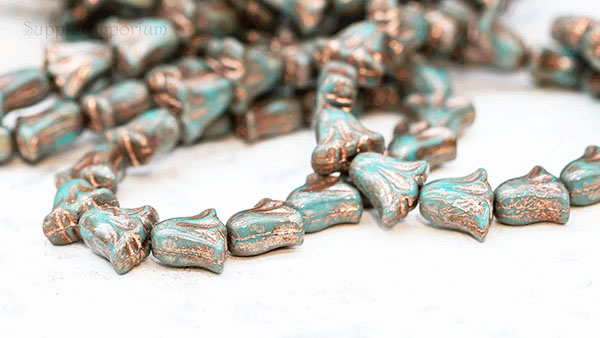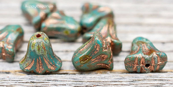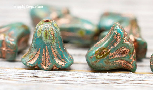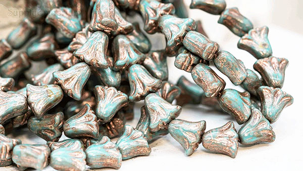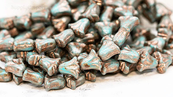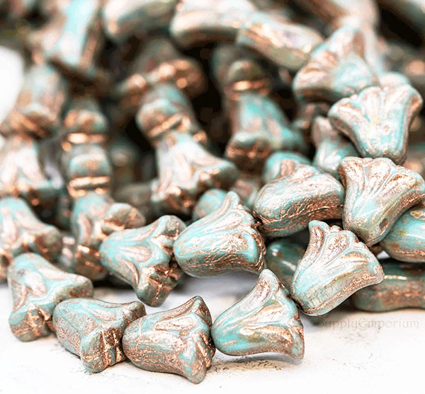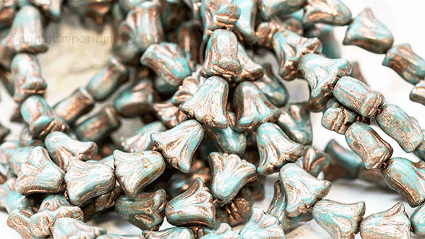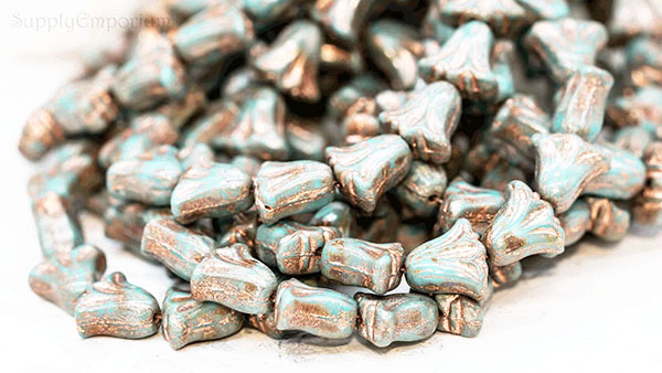 9x10mm Turquoise Blue Copper Picasso Czech Lily Flower – 15 pieces – 7184