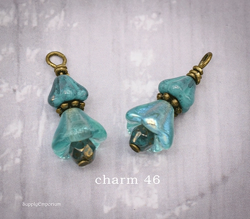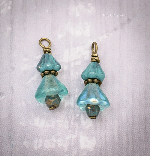 These Czech glass charms are wrapped with antique bronze head pins.