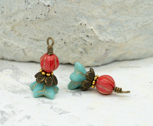 These Czech glass charms are wrapped with Antique Bronze head pins.
