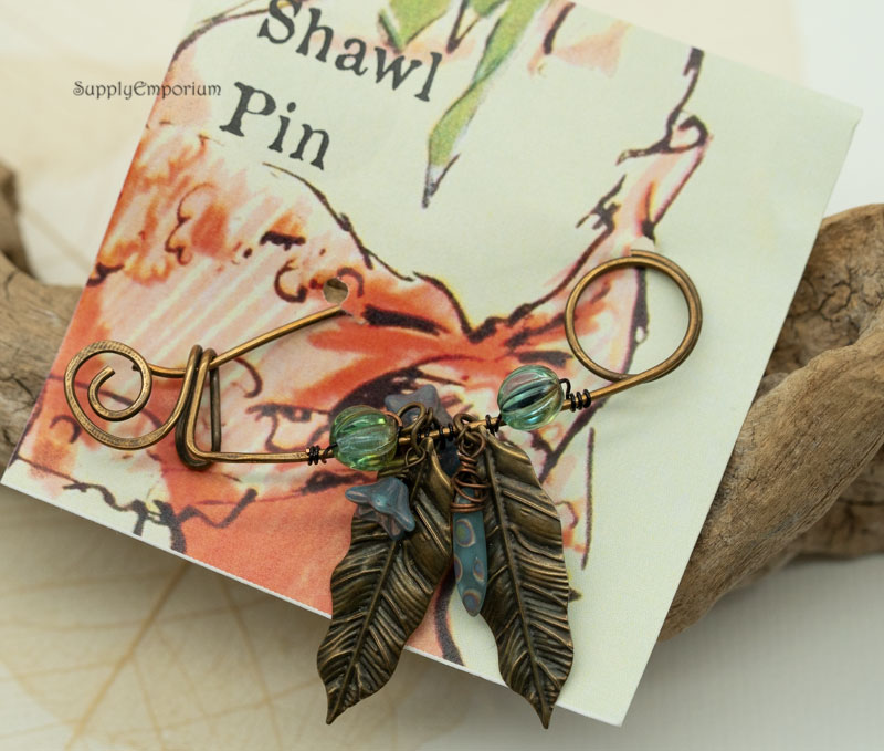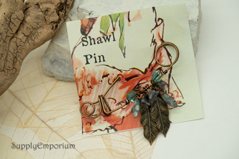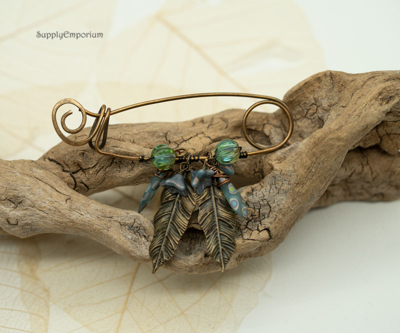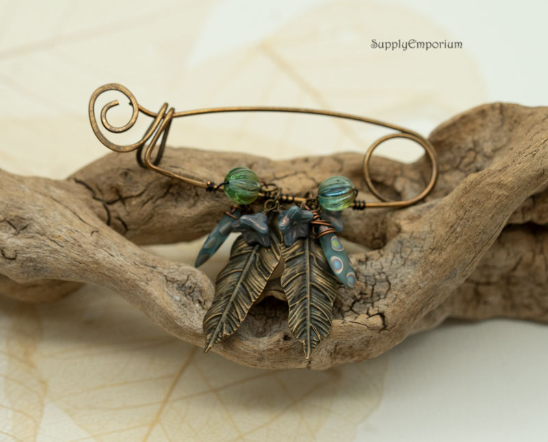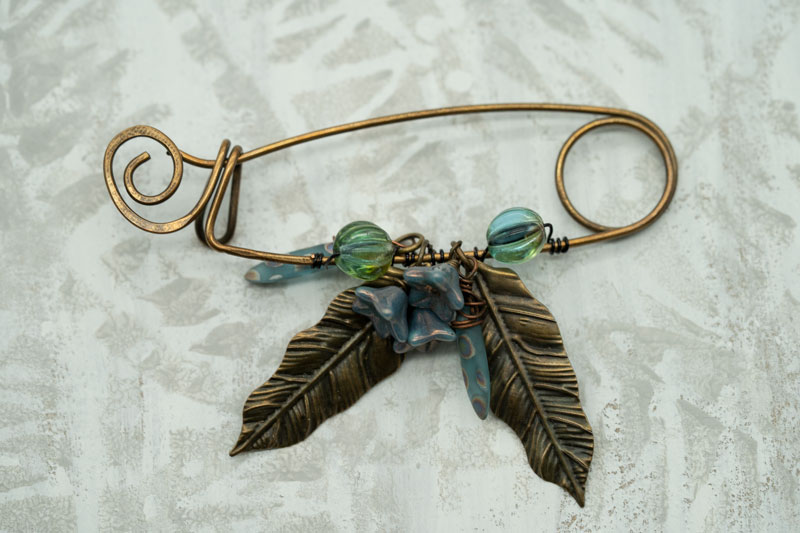 Handmade Bronze Wire Shawl Pin with Czech Glass Bead Dangles – Scarf Pin – 1 Piece – SP2
