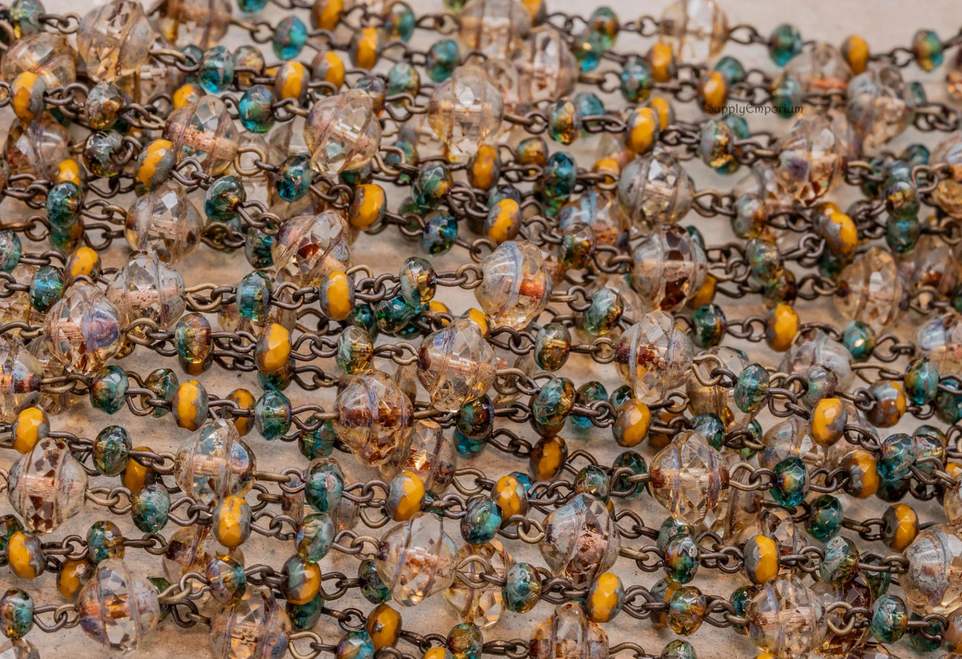 Color: Mix shades and shapes of mustard, turquoise and transparent Picasso quality Czech glass beads. Mixed saturns and rondelle beads. Each bead is individually wire wrapped and hooked together on Antique Brass wire.