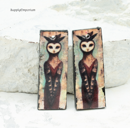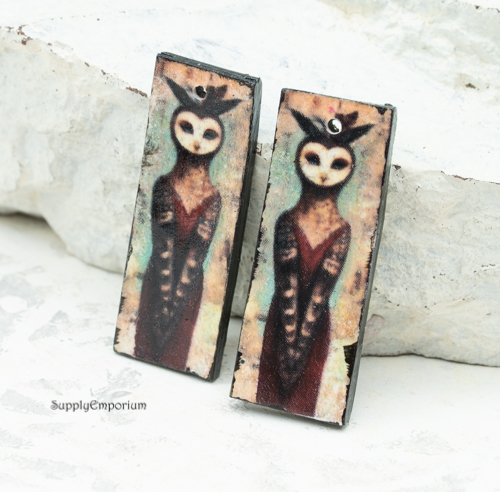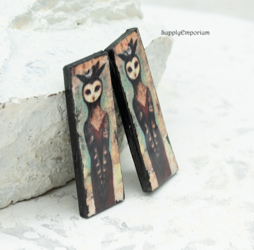 Owl Woman Fantasy Polymer Clay Earring Charms, 2 pieces, 38x14mm, CLAY 5374