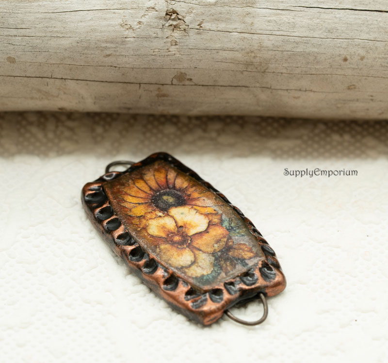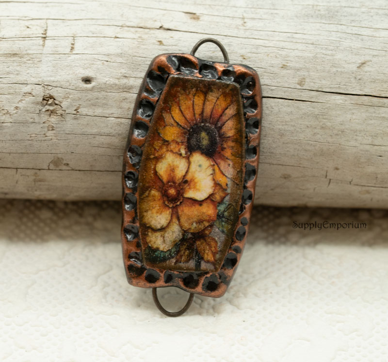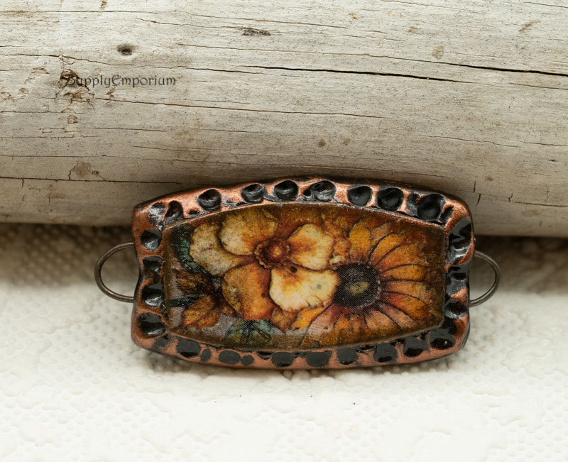 I made an image transfer of a onto clay and baked it. I then layered it over clay to form a thicker base and embedded a loop on each end for attaching your masterpiece. Use as a bracelet bar, or as a pendant and hang drops on the bottom loop.