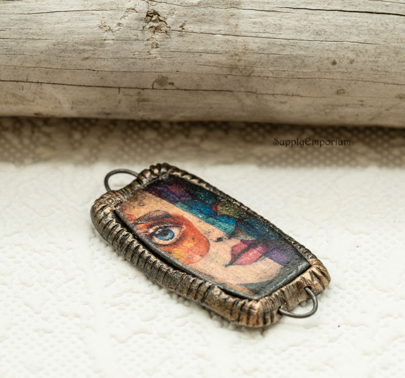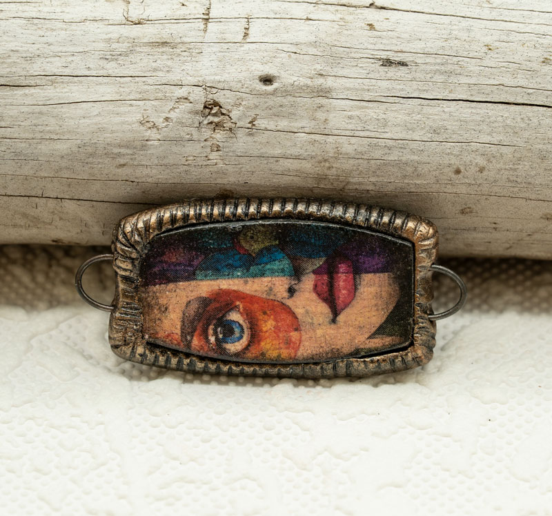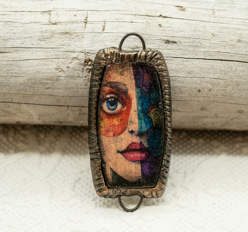 I made an image transfer of a onto clay and baked it. I then layered it over clay to form a thicker base, gave a distressed look, and embedded a loop on each end for attaching your masterpiece. Use as a bracelet bar, or as a pendant and hang drops on the bottom loop.
