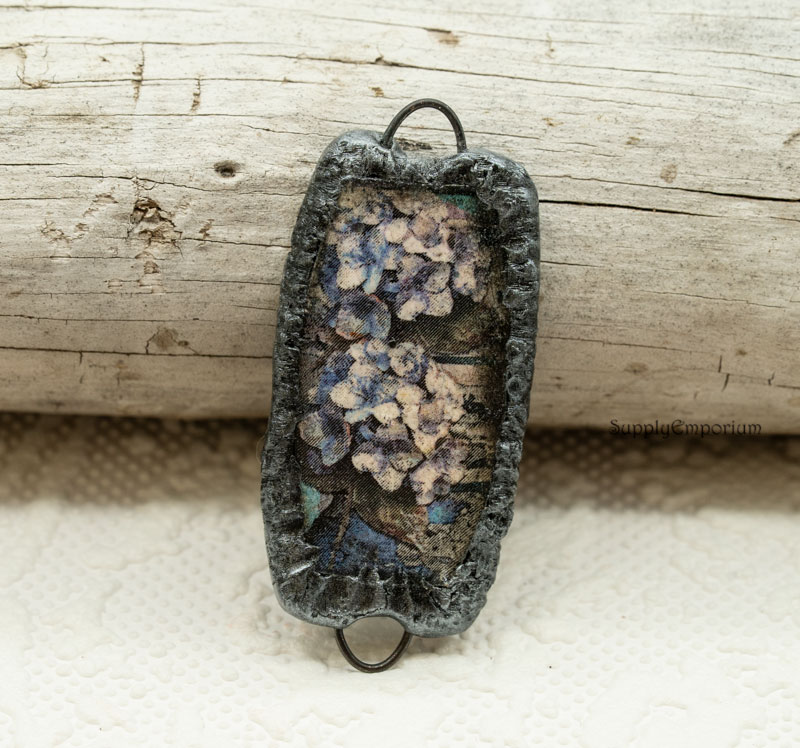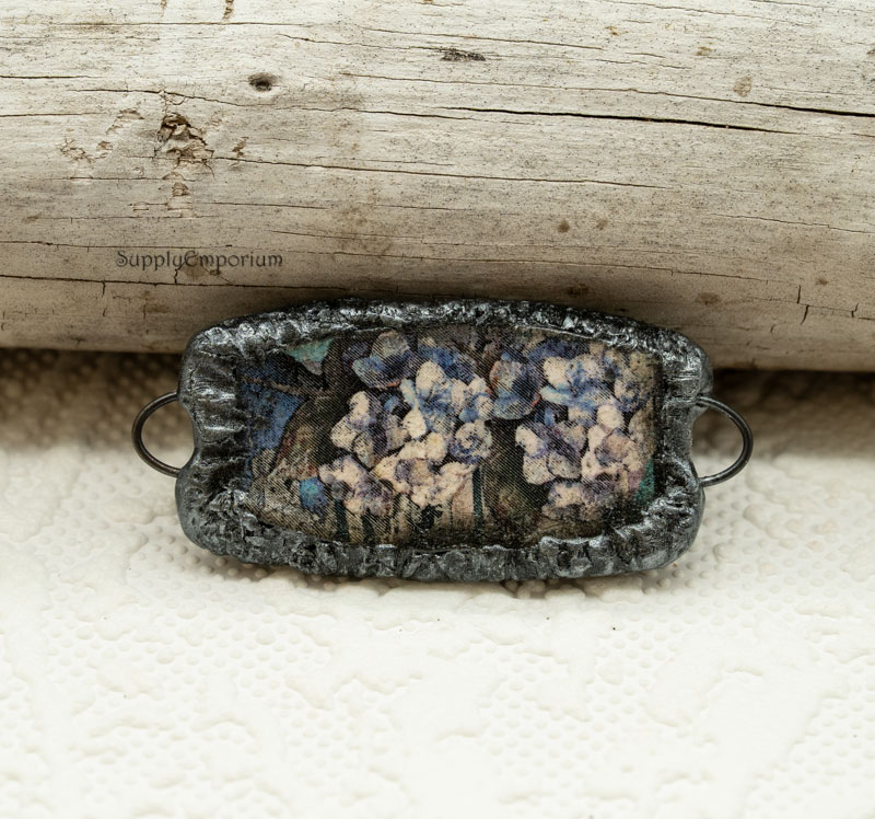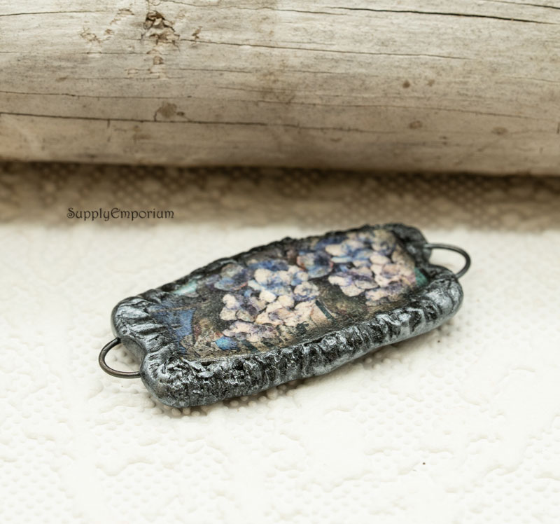 I made an image transfer of a onto clay and baked it. I then layered it over clay to form a thicker base, gave a distressed look, and embedded a loop on each end for attaching your masterpiece. Use as a bracelet bar, or as a pendant and hang drops on the bottom loop.