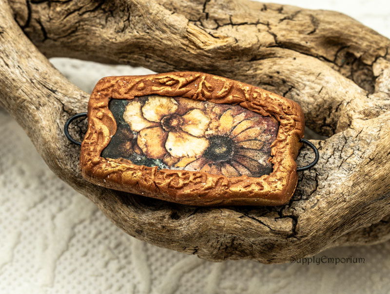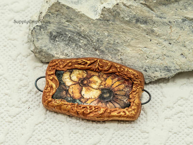 I made an image transfer of a flower on clay and baked it. I then layered it over clay to form a thicker base, gave a distressed look, and embedded a loop on each end for attaching your masterpiece. Use as a bracelet bar, or as a pendant and hang drops on the bottom loop.