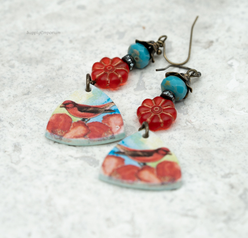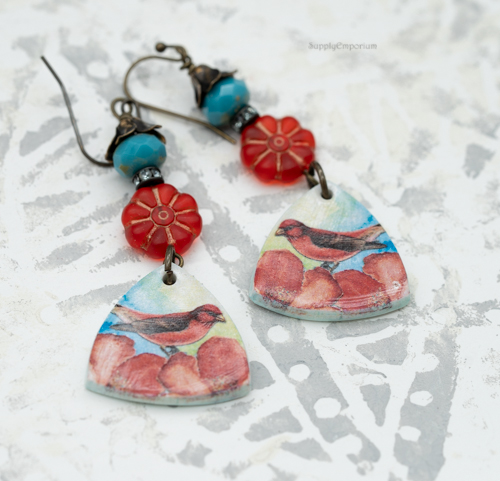 Polymer Clay Boho Teardrop Bird Earrings, 1 Pair, 2 3/4″ Long, Clay 5402