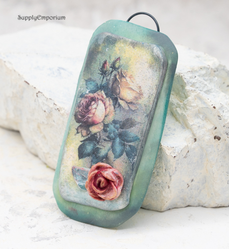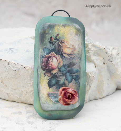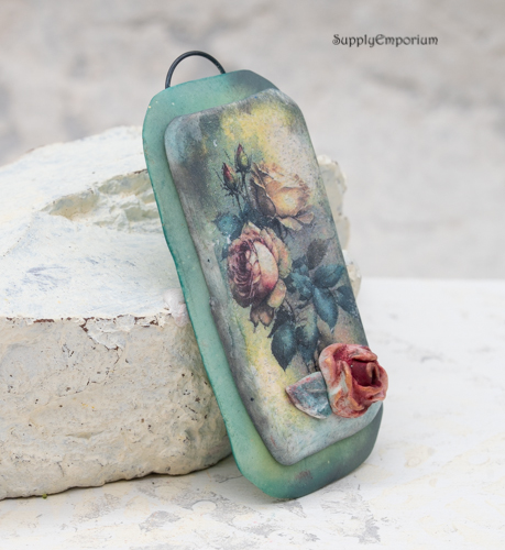 Handmade and sealed with matte varnish after baking. 3D rose highlighted with gloss varnish for a bit of contrast