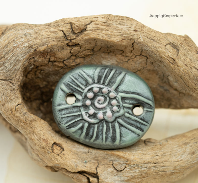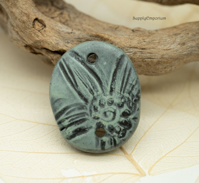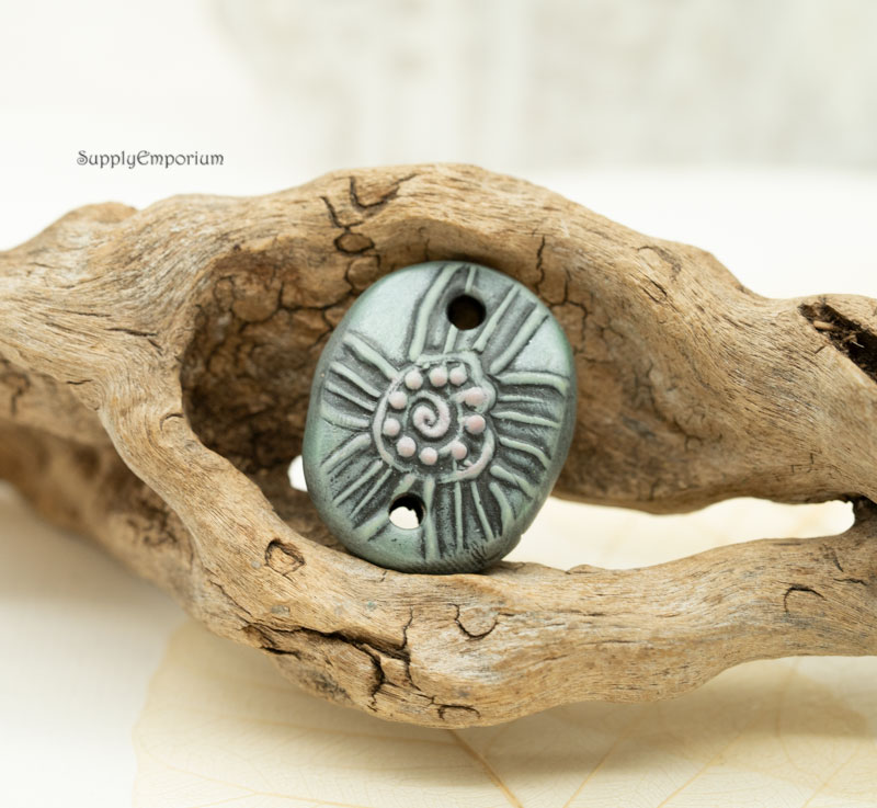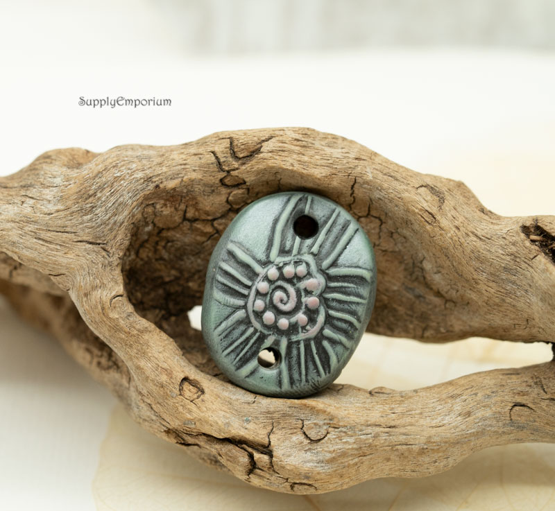 Shape: Irregular oval with 4mm hole on each end. Back is nicely stamped and colored (see last photo)