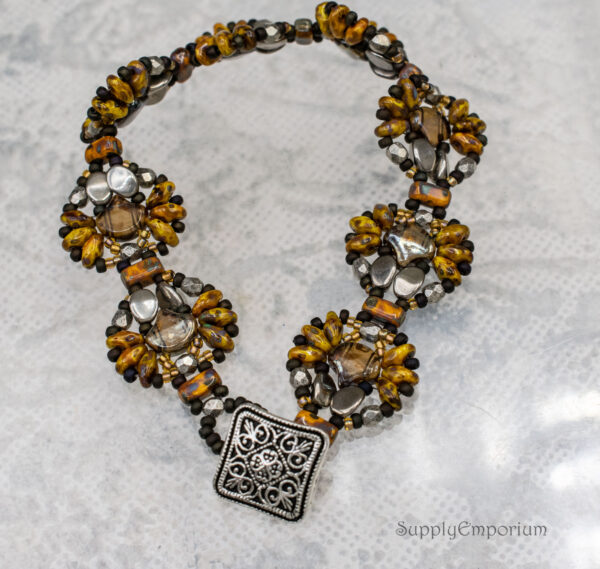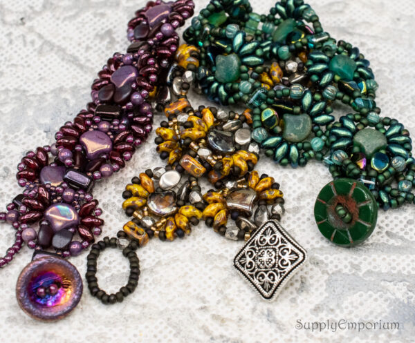 This pattern is for an intermediate beader and has instructions for attaching a button. If you should decided to used an alternate clasp attached with jump rings, I’ve covered that method briefly.