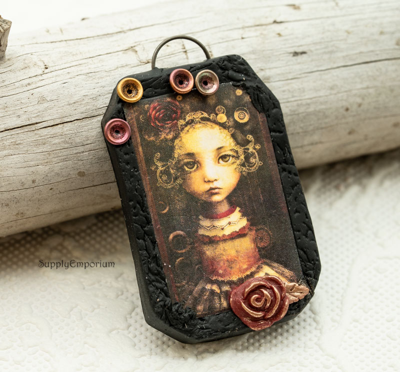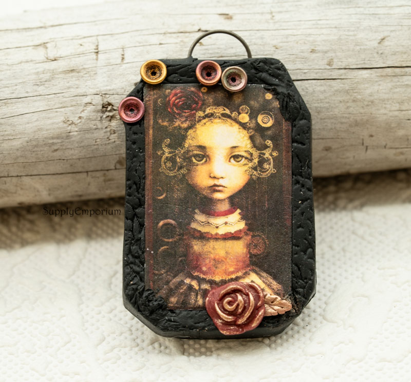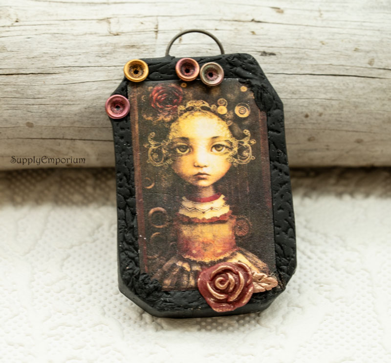 Purchased image of a girl I transferred to clay. I textured a ‘frame’ for the awesome artwork and made 3D embellishments to mimic the image. Back is nicely finished.