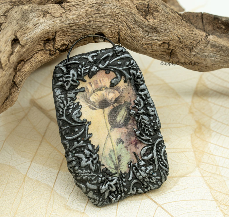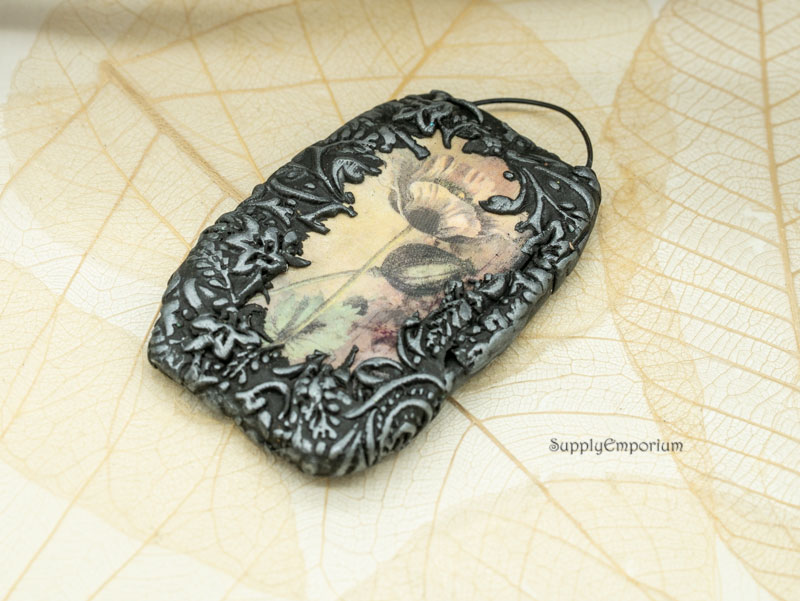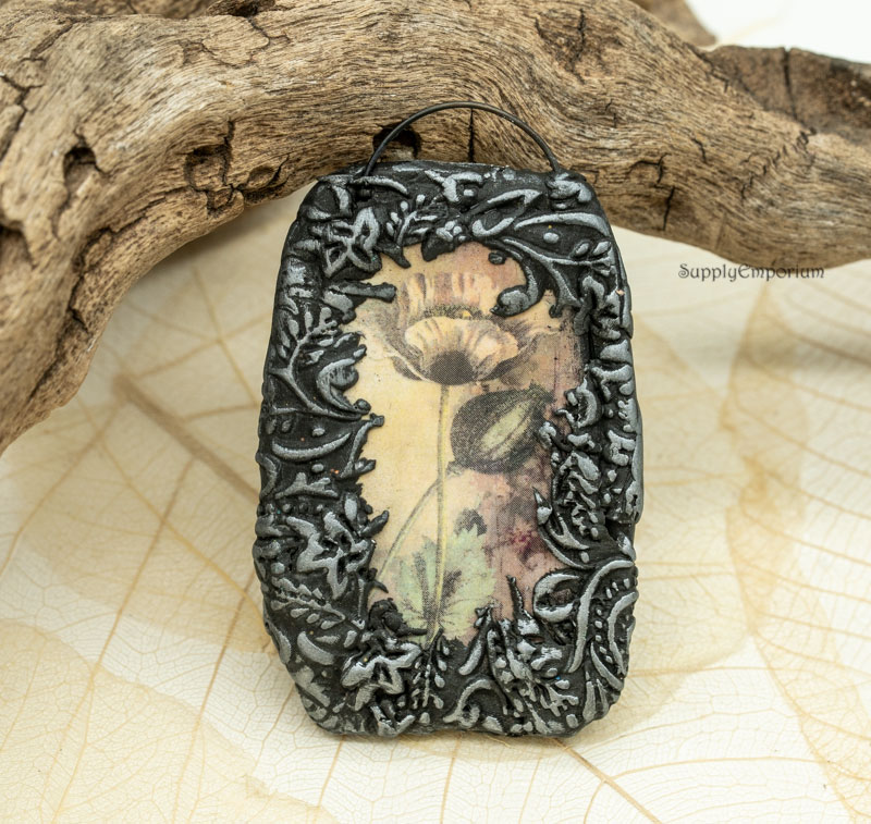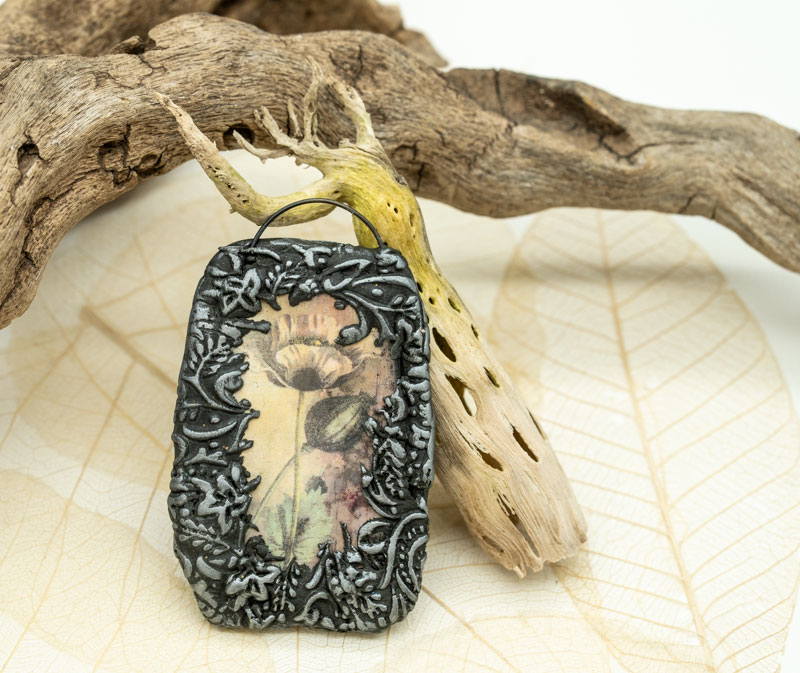 Purchased image of a gorgeous vintage look flowers transferred to clay. I textured a ‘frame’ for the awesome artwork to imitate ‘faux solder’. Back is nicely finished.