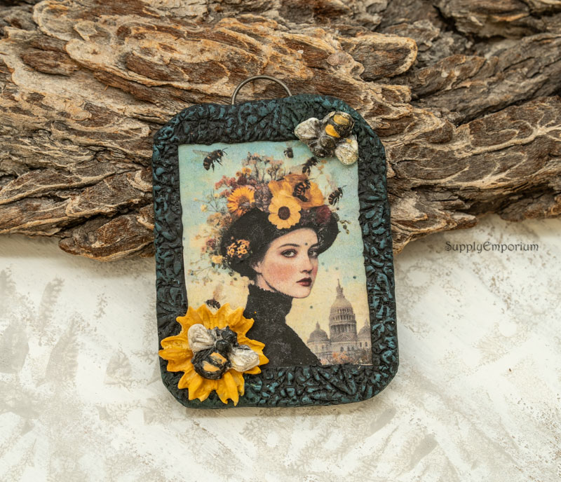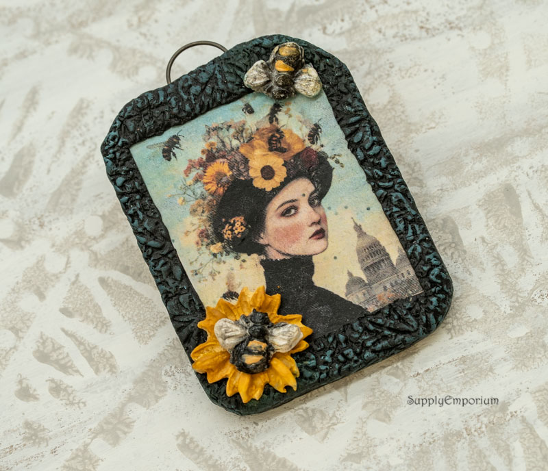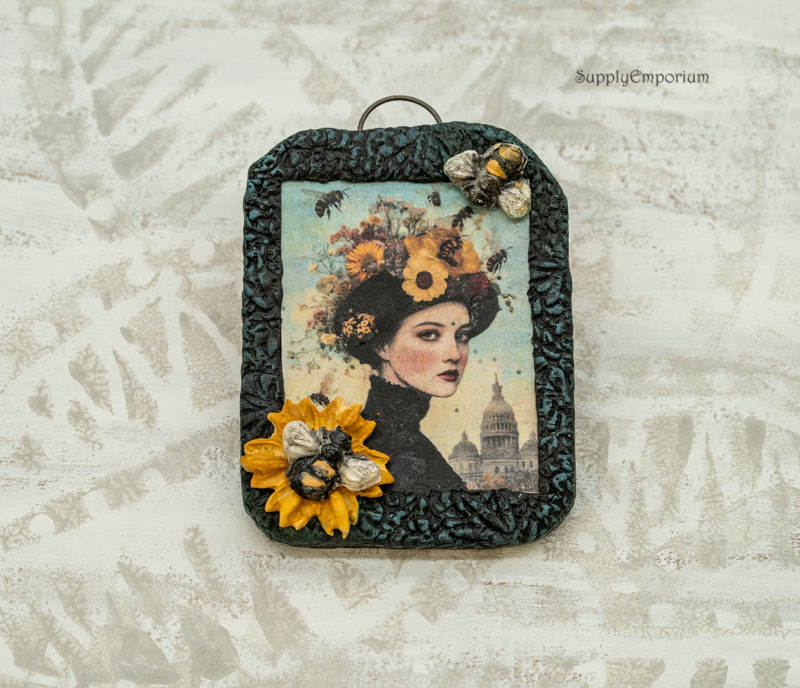 Purchased image of a lady I transferred to clay. I textured a ‘frame’ for the awesome artwork and made 3D embellishments to mimic the image. Back is nicely finished.