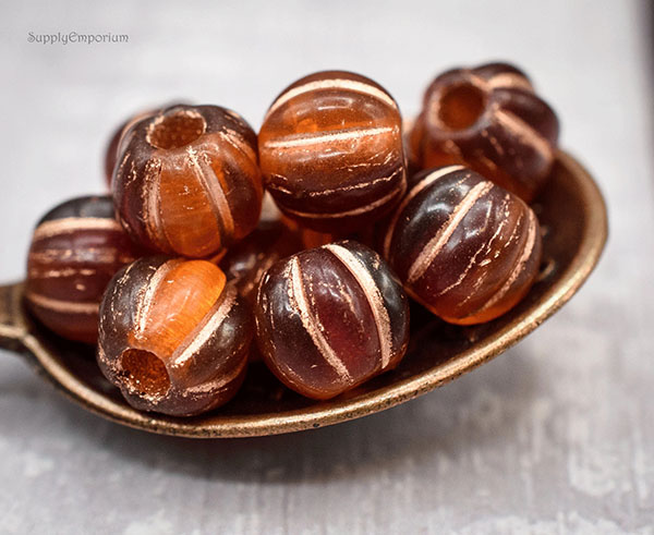 Added to your favorites.Add to cart 8mm Red Orange w/Copper Wash Czech Large Hole Melon – 10 pieces – 7357ROC3$4.00